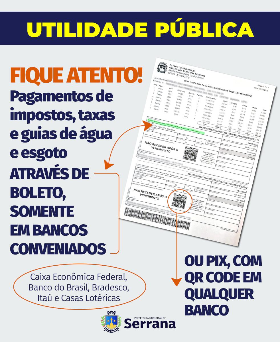 Os pagamentos de impostos, taxas e guias de água e esgoto da Prefeitura de Serrana devem ser feitos somente através de boleto em bancos conveniados: